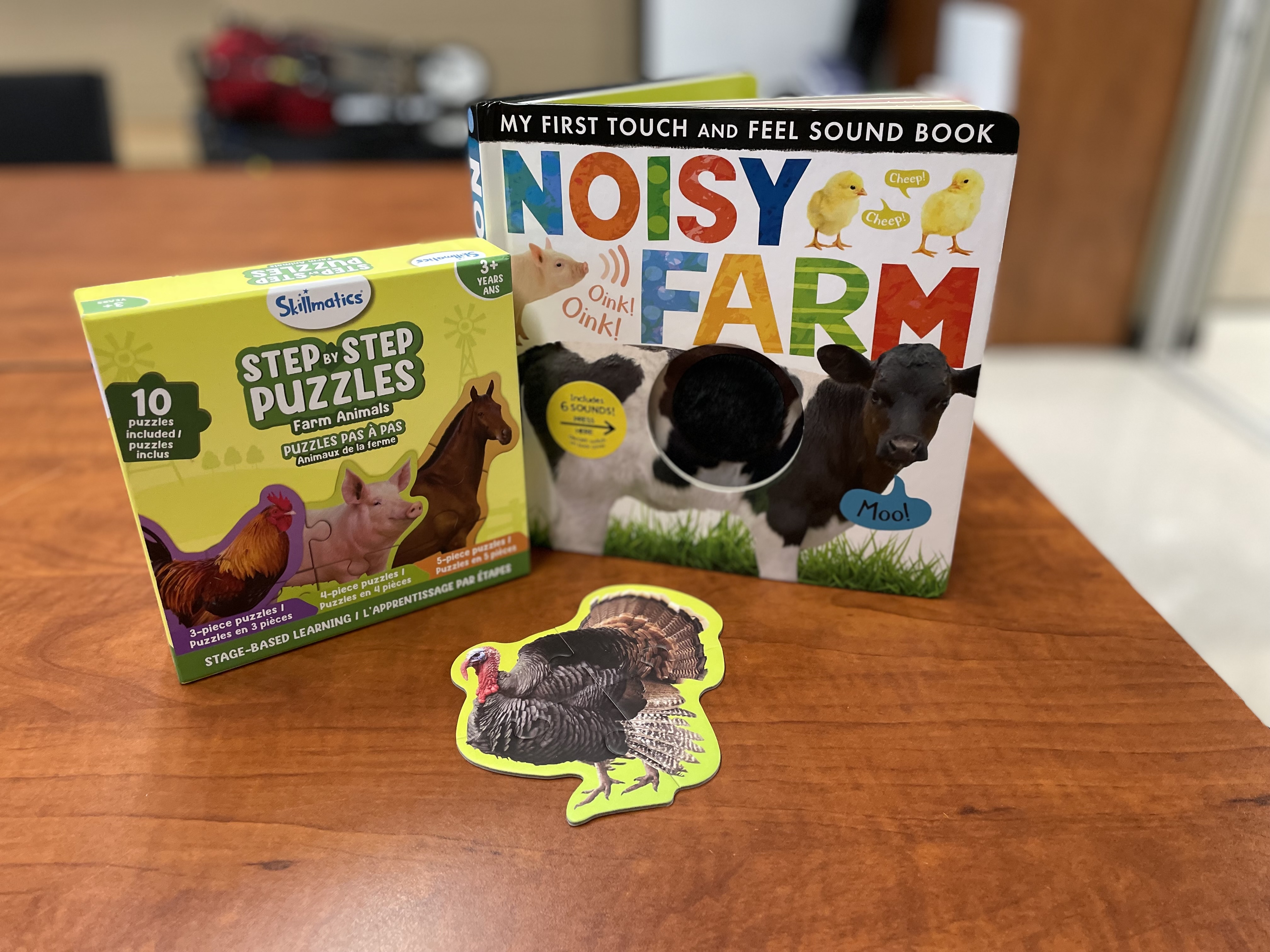 Enjoy this book that features animal sounds and a puzzle to complete together!