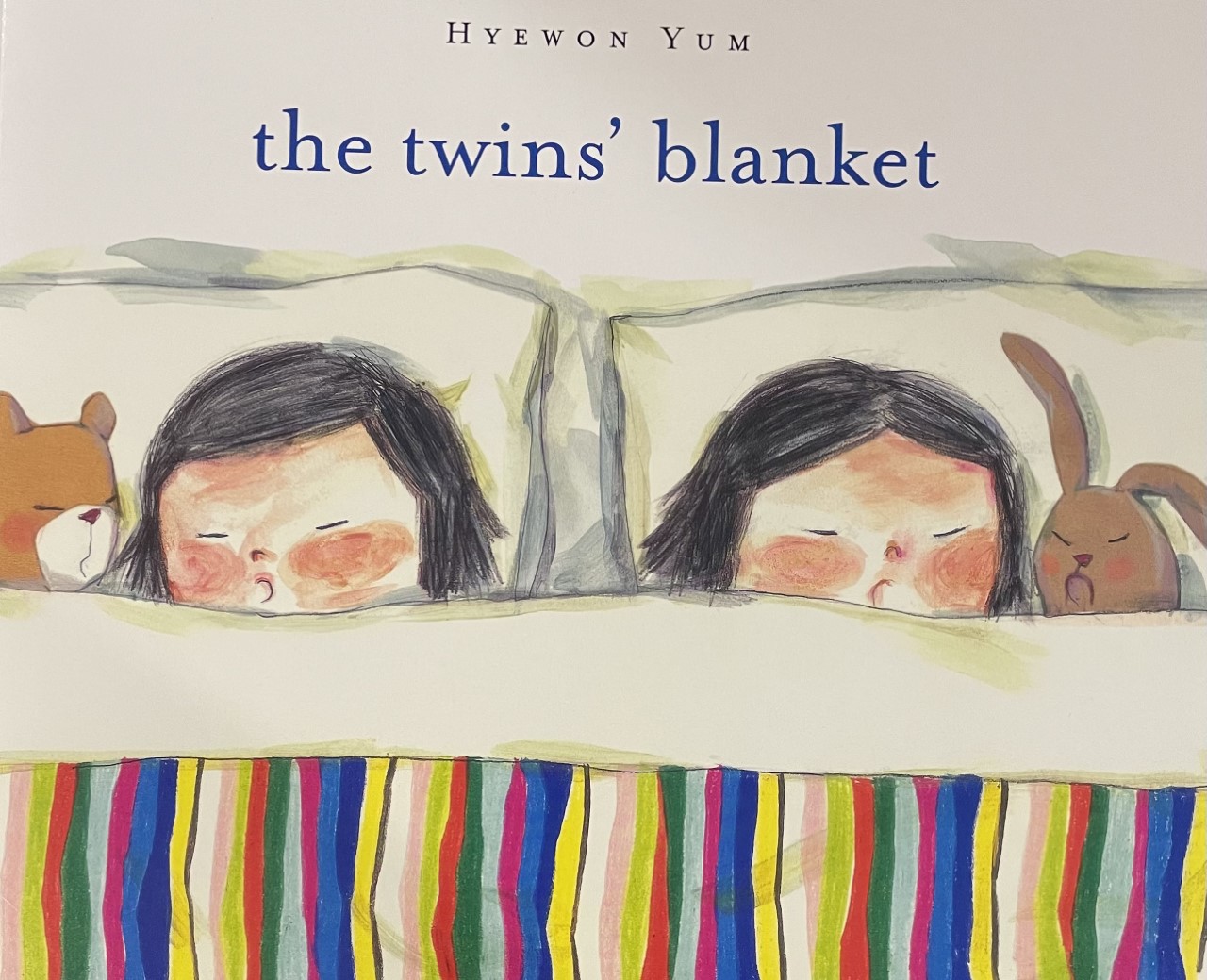 The Twins' Blanket, is about siblings, sharing, and growing up--starring a Korean-American family--and is now celebrating its 10th Anniversary! These look-alike twins have always shared everything―their room, their toys, a crib, and, since the day they were born, a blanket. But as they grow into new beds, they need new blankets, too. Now they face a new dilemma: they don't know how not to share. Told from the perspective of two five-year-old's, The Twins' Blanket playfully illuminates squabbles and affection between young siblings. Yum's minimalistic art astutely captures these twins' emotions as they toss, turn, and tug their new and old blankets―and embrace their growing independence.(Family and Well-Being)