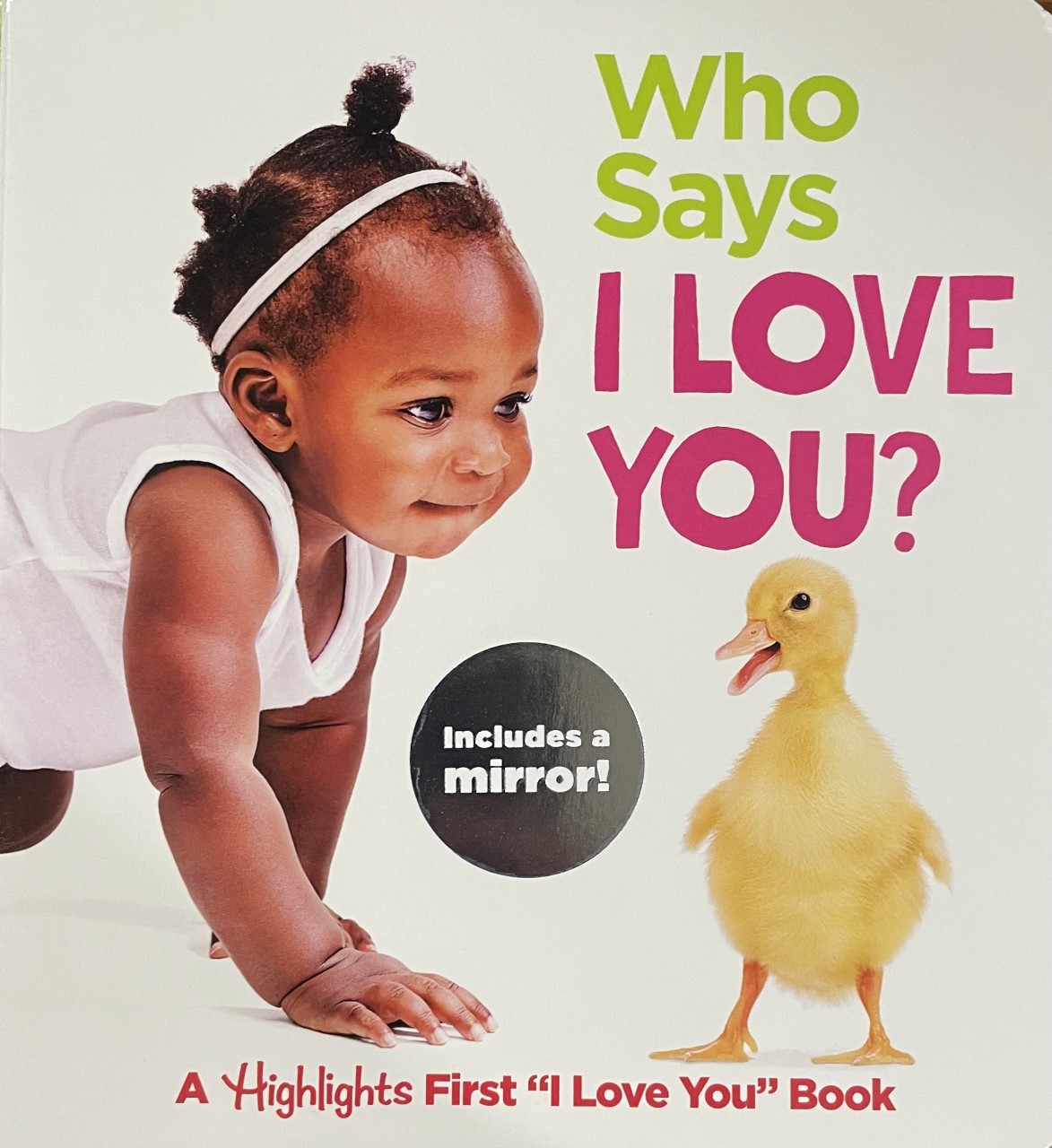 Dog days I love you with woof woof woof. Cat says I love you with a meow meow meow. How do you say I love you? Your little one will love repeating animal sounds and saying "I Love You" while looking in the heart-shaped mirror. This delightful guessing game is perfect for you and Baby to play together. (Infants)